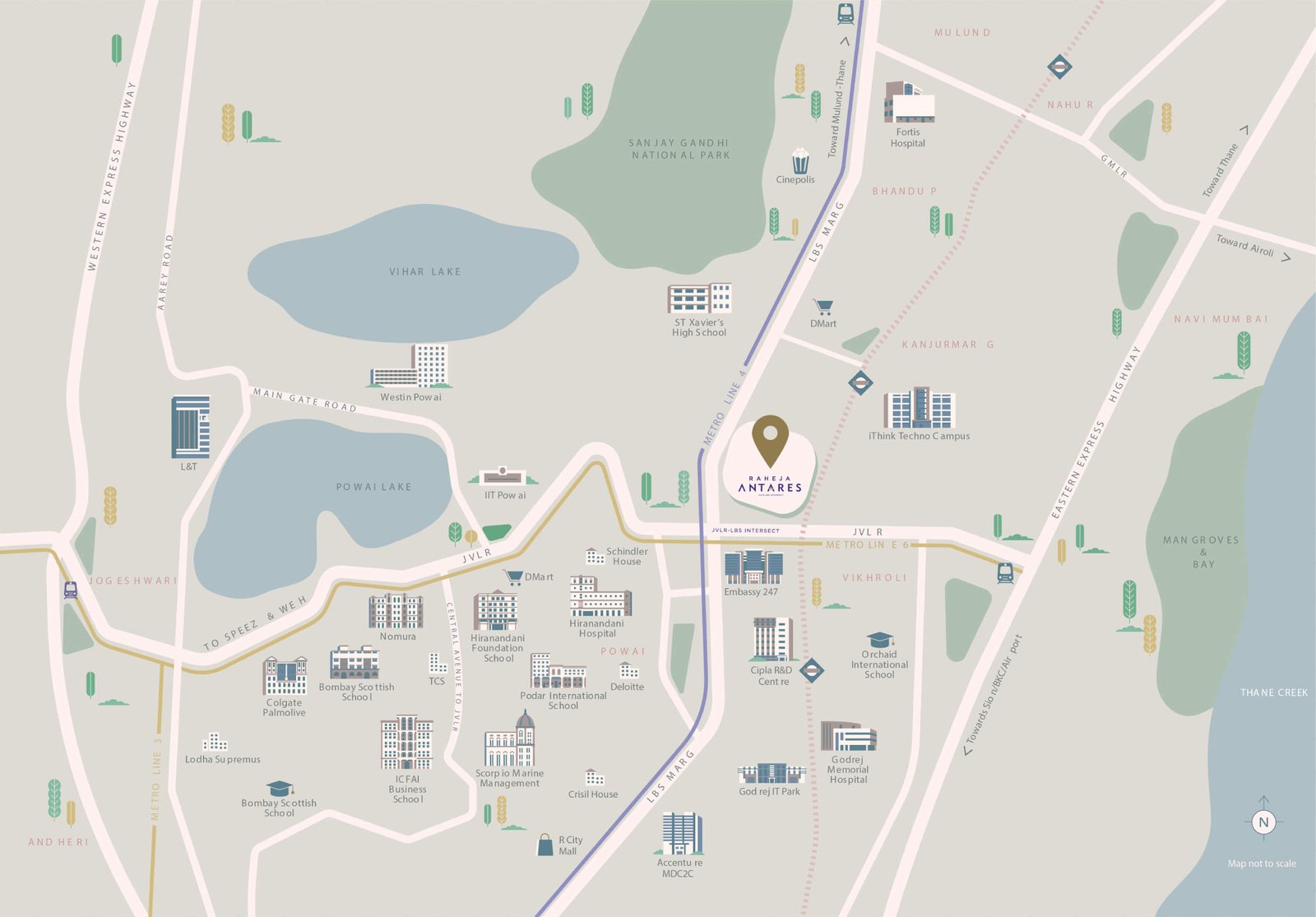 Raheja Antares, opposite Powai Telephone Exchange, Laxmi Udyog Nagar, Kanjurmarg West, Bhandup West, Mumbai, Maharashtra 400078